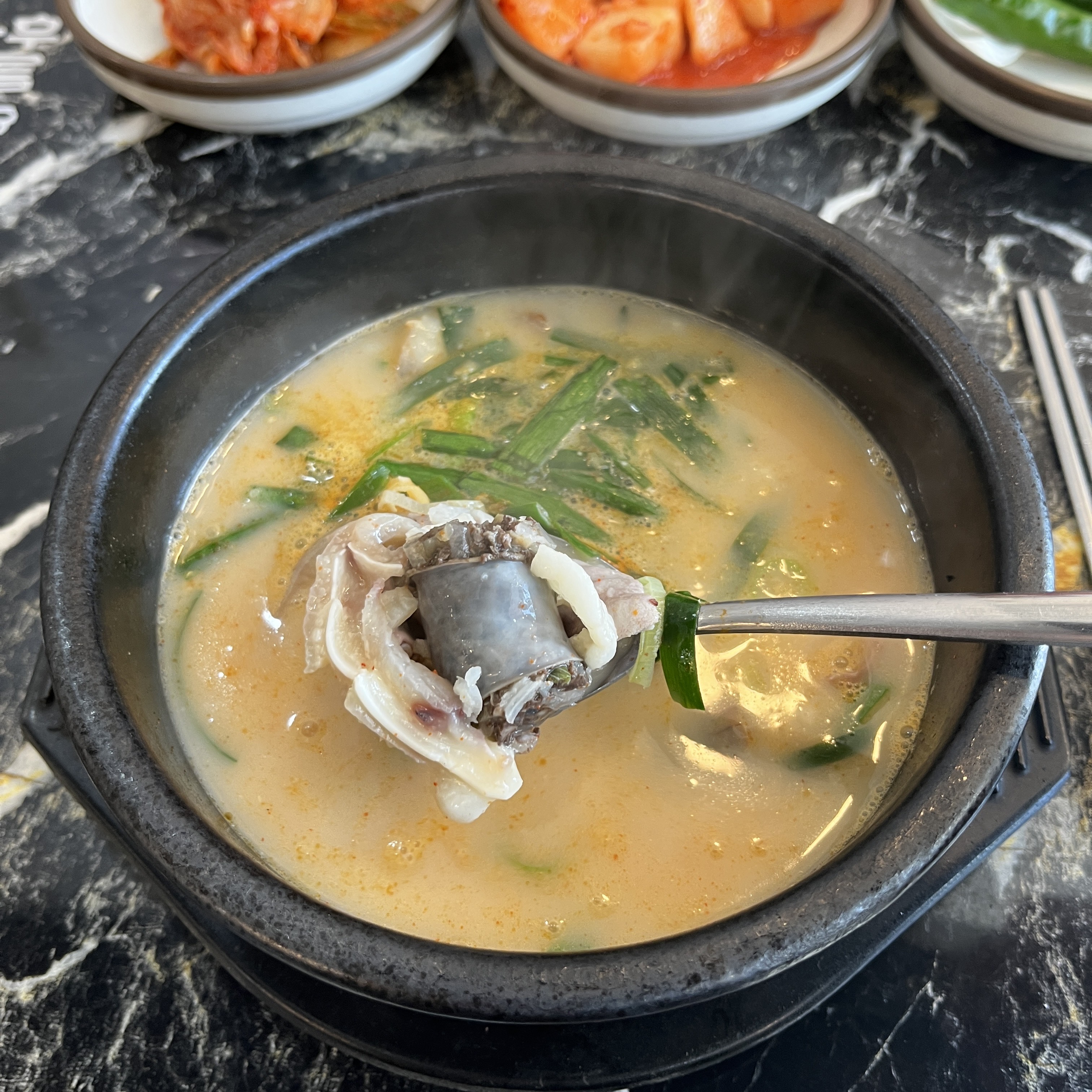 순댓국은 매우 맛있고 좋았습니다. 제가 조금 짜게 먹는 편인데도 불구하고 간을 별로 하지 않아도 제 입맛에 딱 맞았습니다. 새우젓 또한 매우 맛있고 새우가 실했습니다. 저는 국밥집의 새우젓을 보면 국밥집을 다 파악할 수 있습니다. 이 집은 새우젓부터 아주 고급지고 튼실했습니다. 맛 좋은 순대와 조금의 새우젓을 함께 먹고 그 후에 순대국밥 국물에 밥을 말아먹으니 더할 나위 없이 좋은 하루였습니다.
